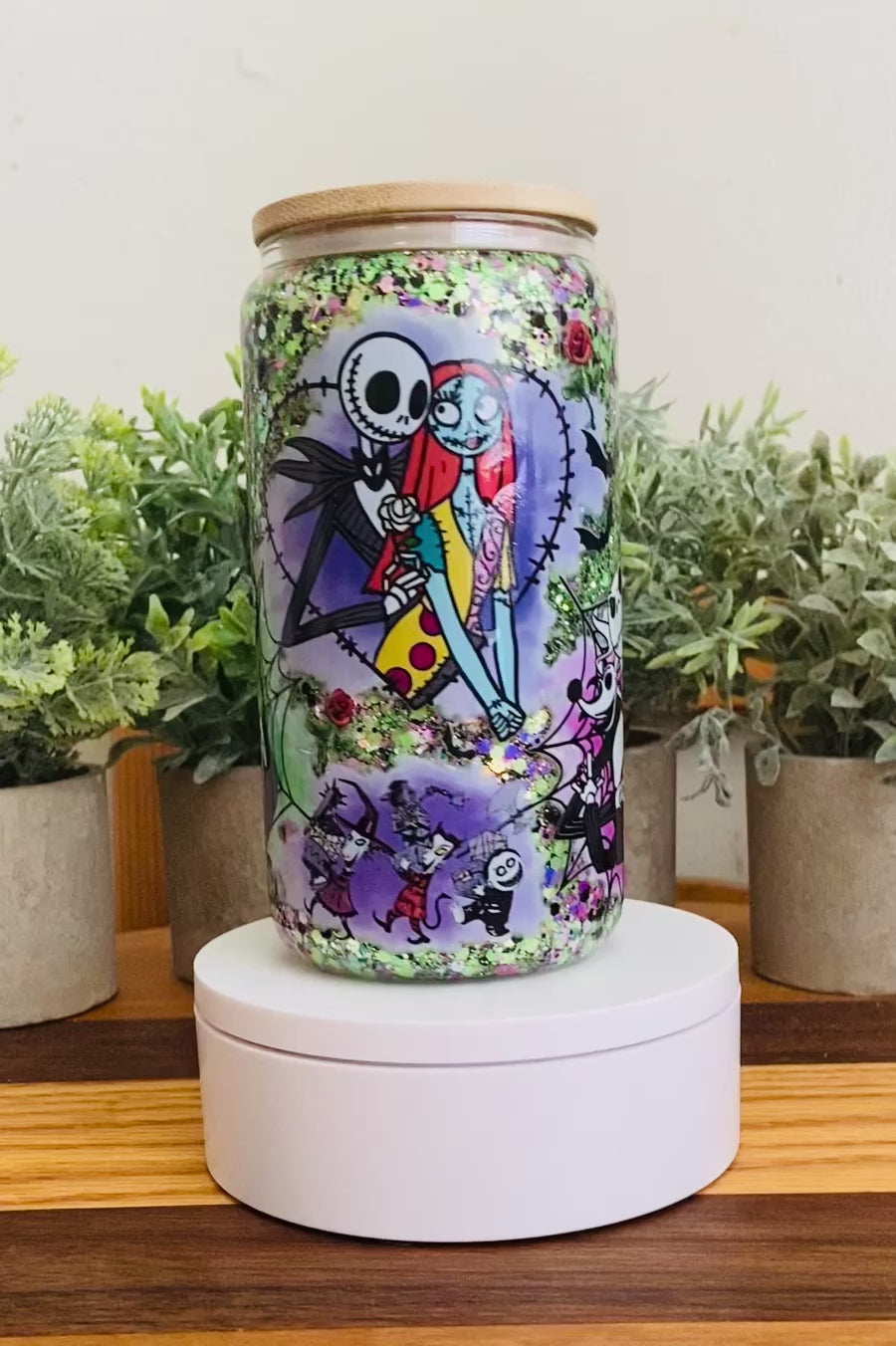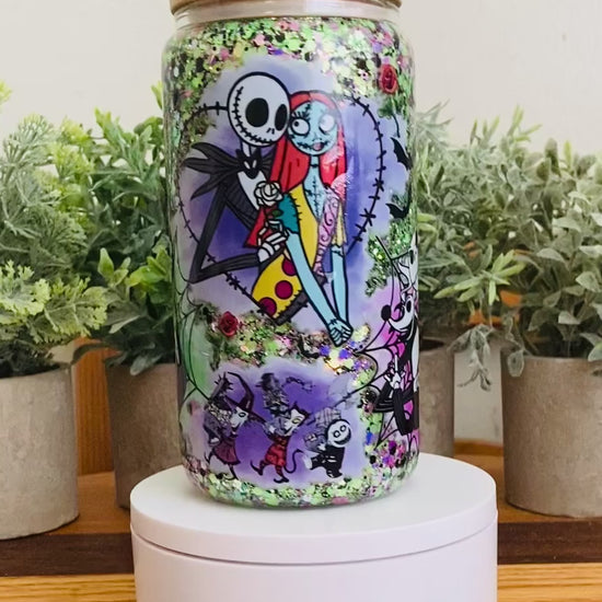 Bring sparkle and fun to your drinks with our spooky 16 oz glass Snow Globe Tumbler featuring a spooky Jack and Sally from NBC! This playful yet practical tumbler combines eye-catching glitter movement with everyday functionality—perfect for keeping your favorite drinks cool while showing off your style.