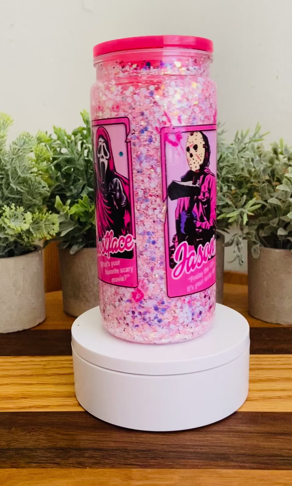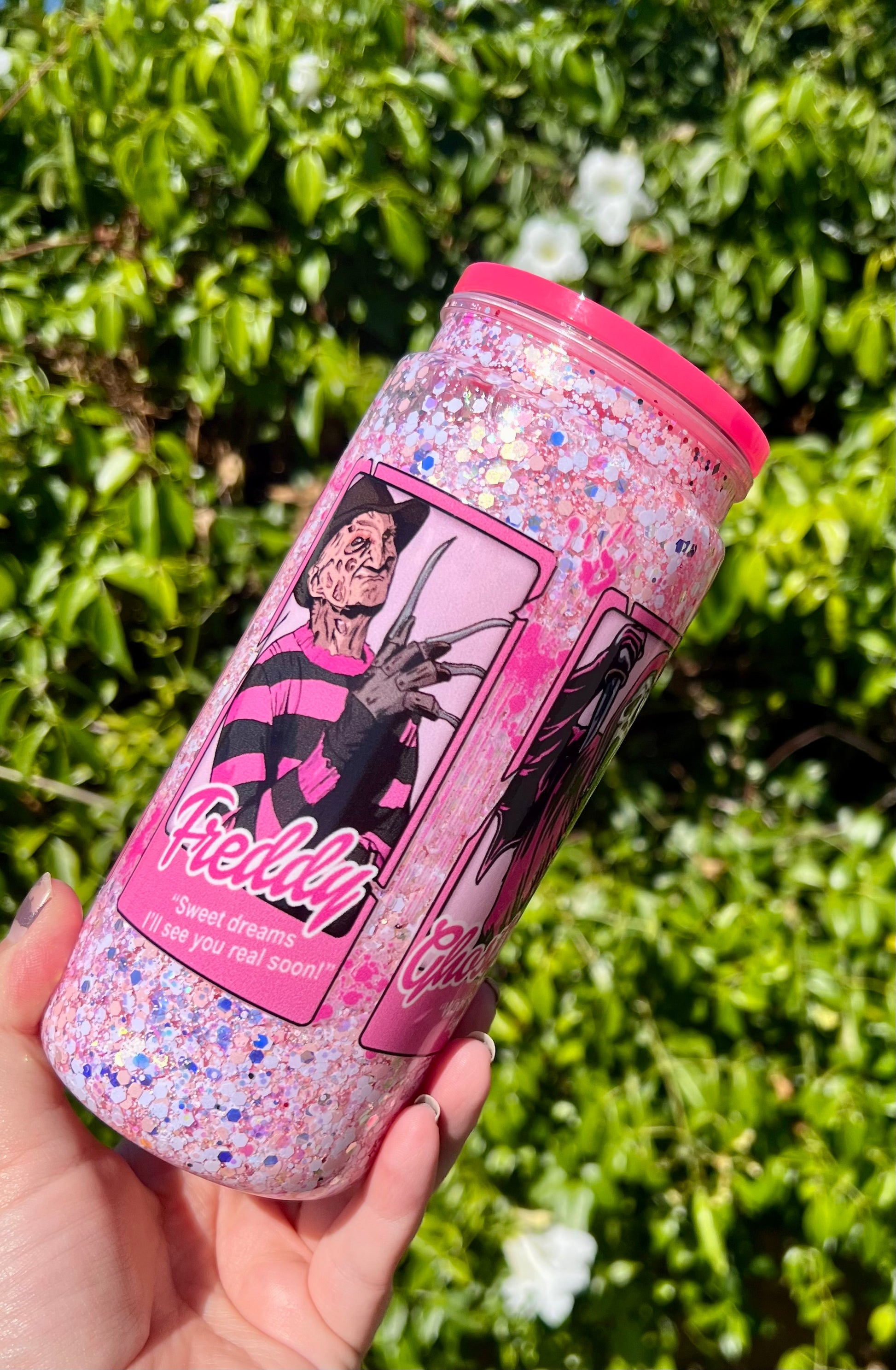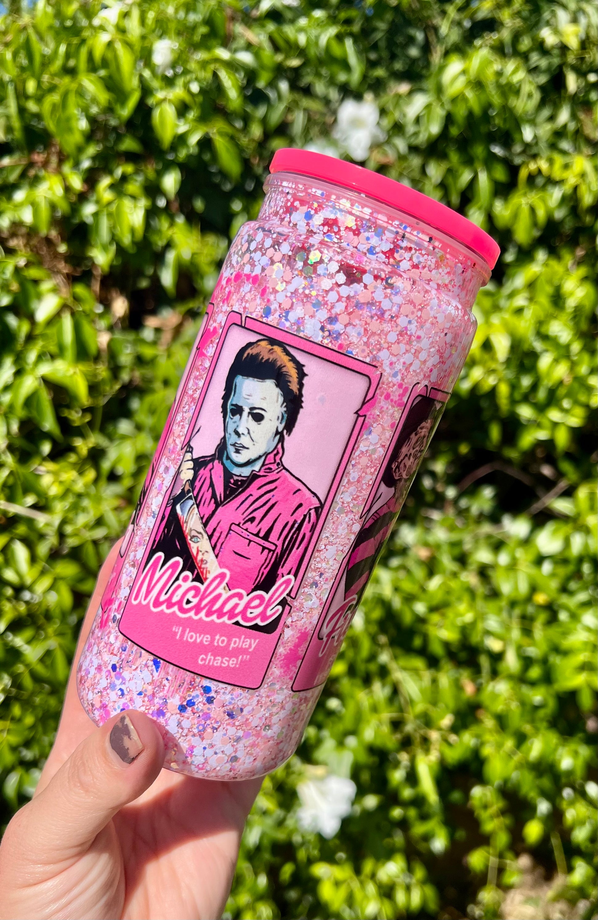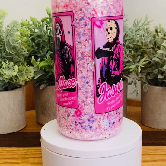 Bring sparkle and fun to your drinks with our spooky 20 oz acrylic Snow Globe Tumbler featuring the boys of Halloween in a pretty in pink theme! This playful yet practical tumbler combines eye-catching glitter movement with everyday functionality—perfect for keeping your favorite drinks cool while showing off your style.