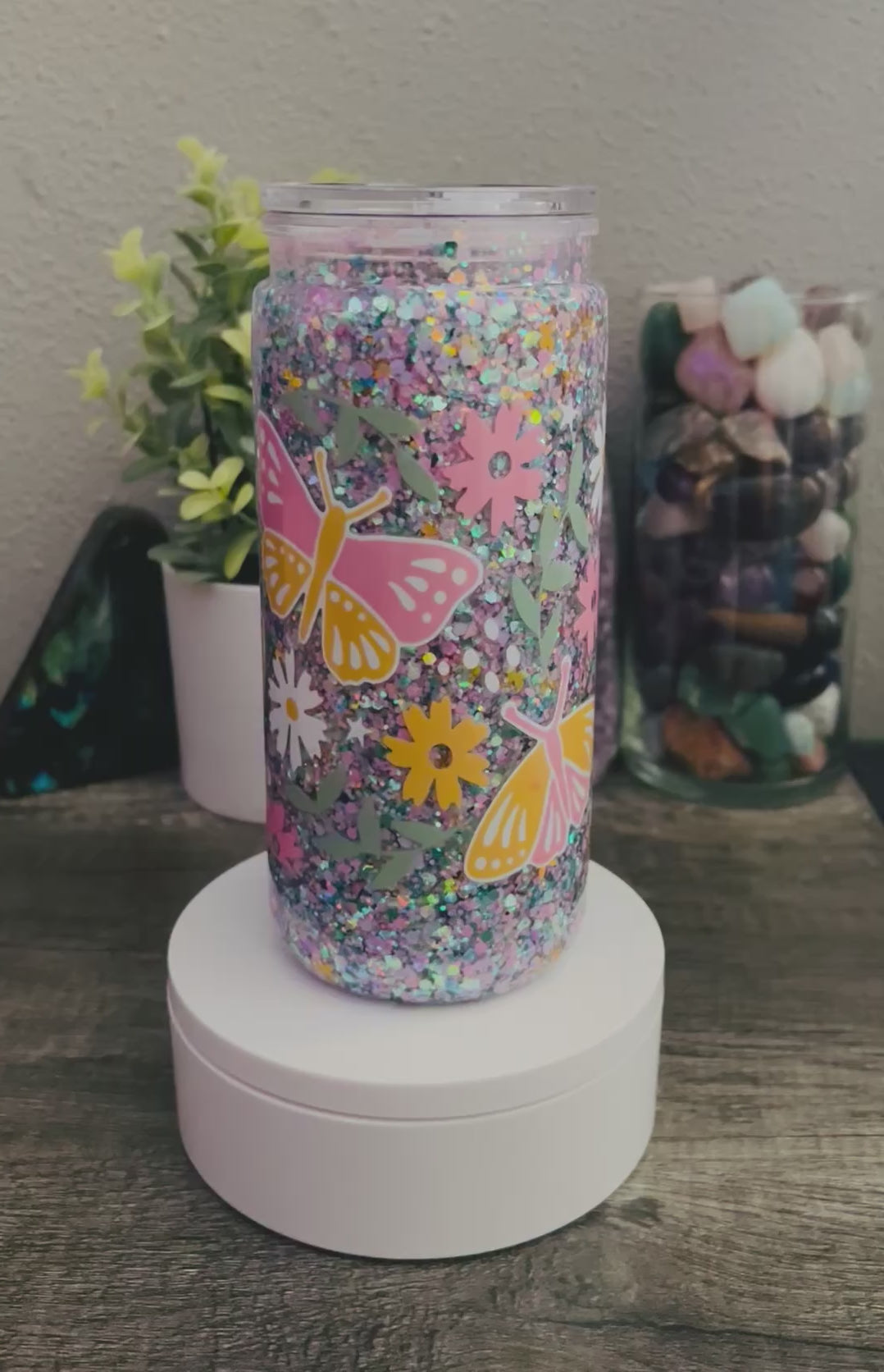 20 oz Acrylic Snow Globe Butterflies & Flowers Glitter Tumbler