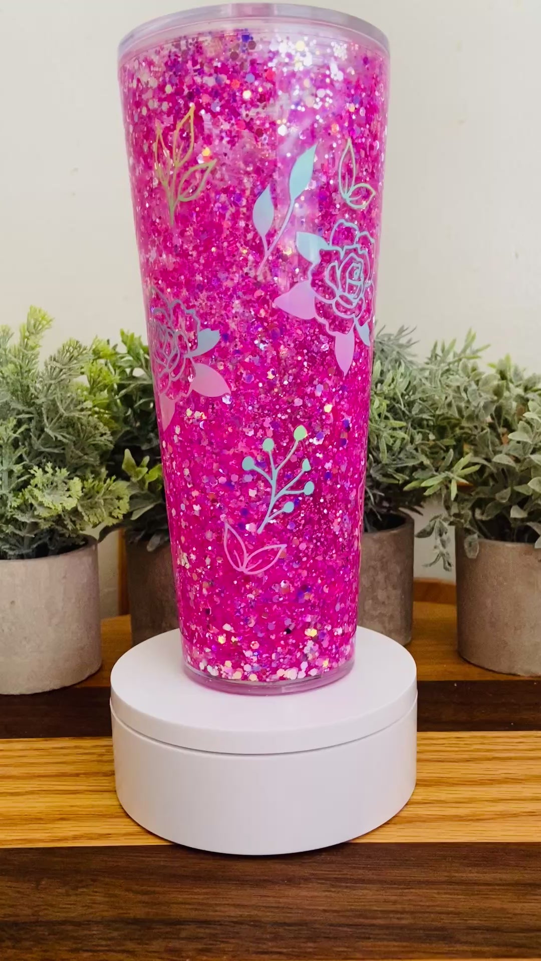 Bring sparkle and fun to your drinks with our 24 oz Acrylic Snow Globe Tumbler featuring a beautiful ombré floral decal! This playful yet practical tumbler combines eye-catching glitter movement with everyday functionality—perfect for keeping your favorite drinks cool while showing off your style.