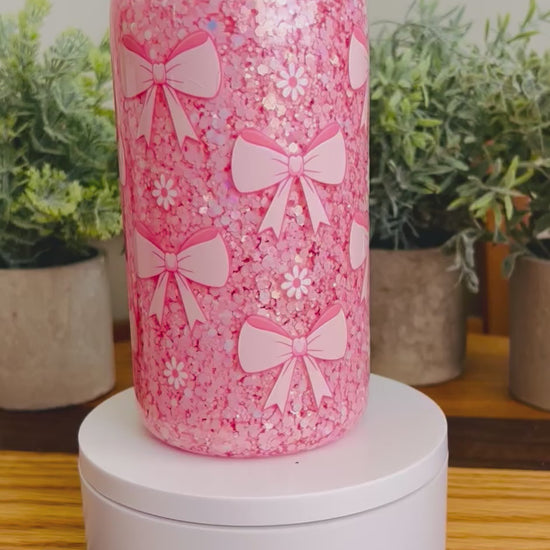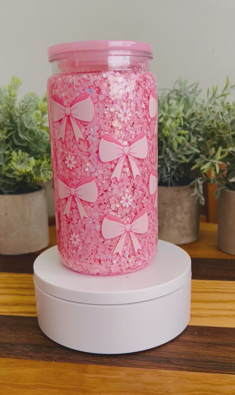 16 oz Acrylic Snow Globe Pink Coquette Bow Glitter Tumbler